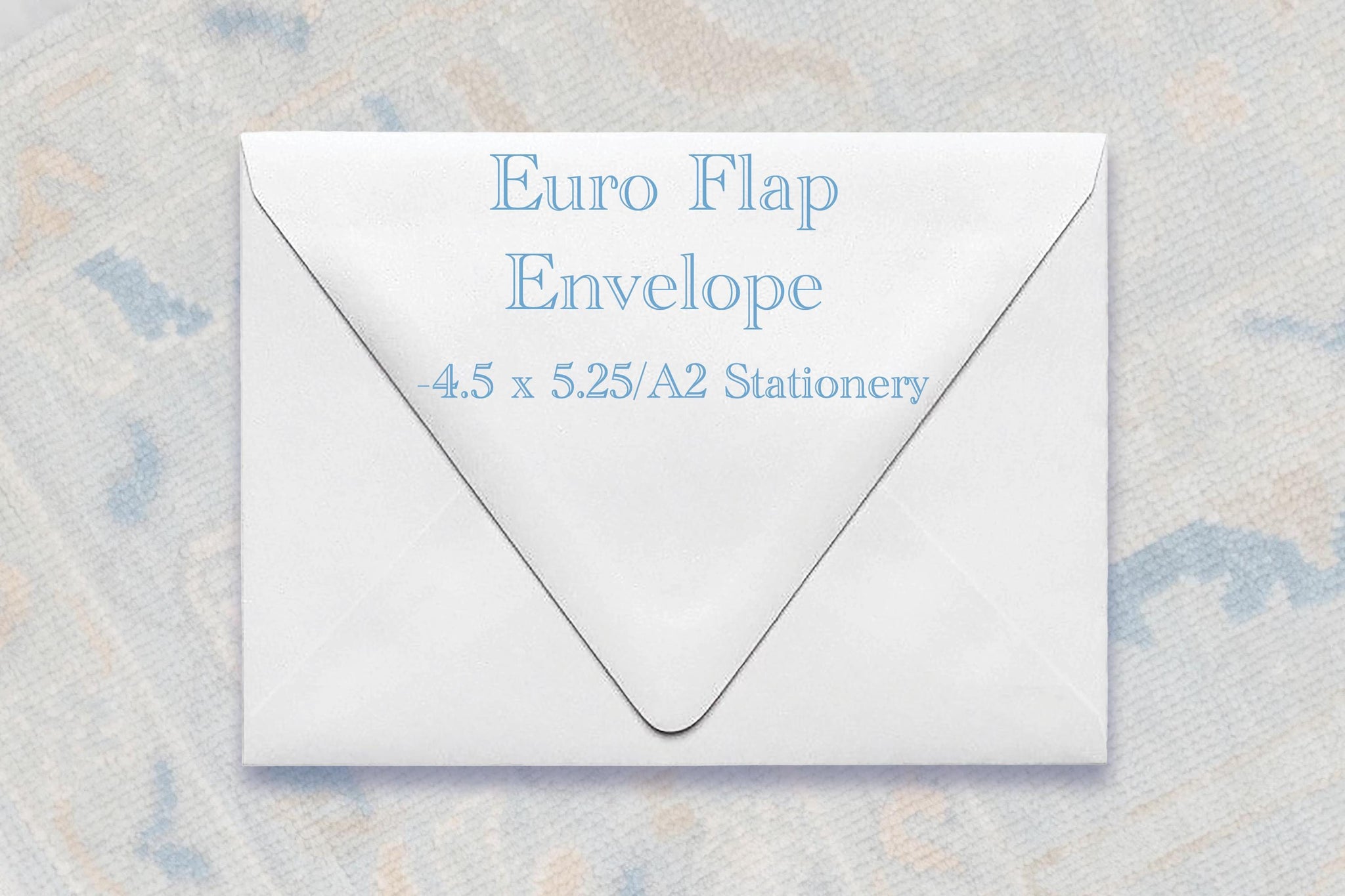 Upgrade your A2 (4.25" x 5.5") card envelopes from a straight flap to a Euro flap for a more elevated, timeless look. This listing is an envelope upgrade add-on only and must be purchased with your A2 stationery order (quantity must match your stationery set).