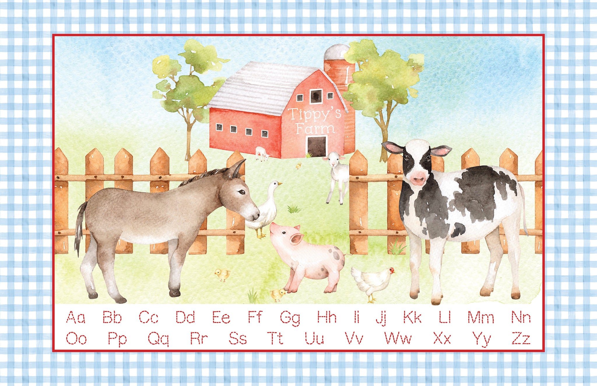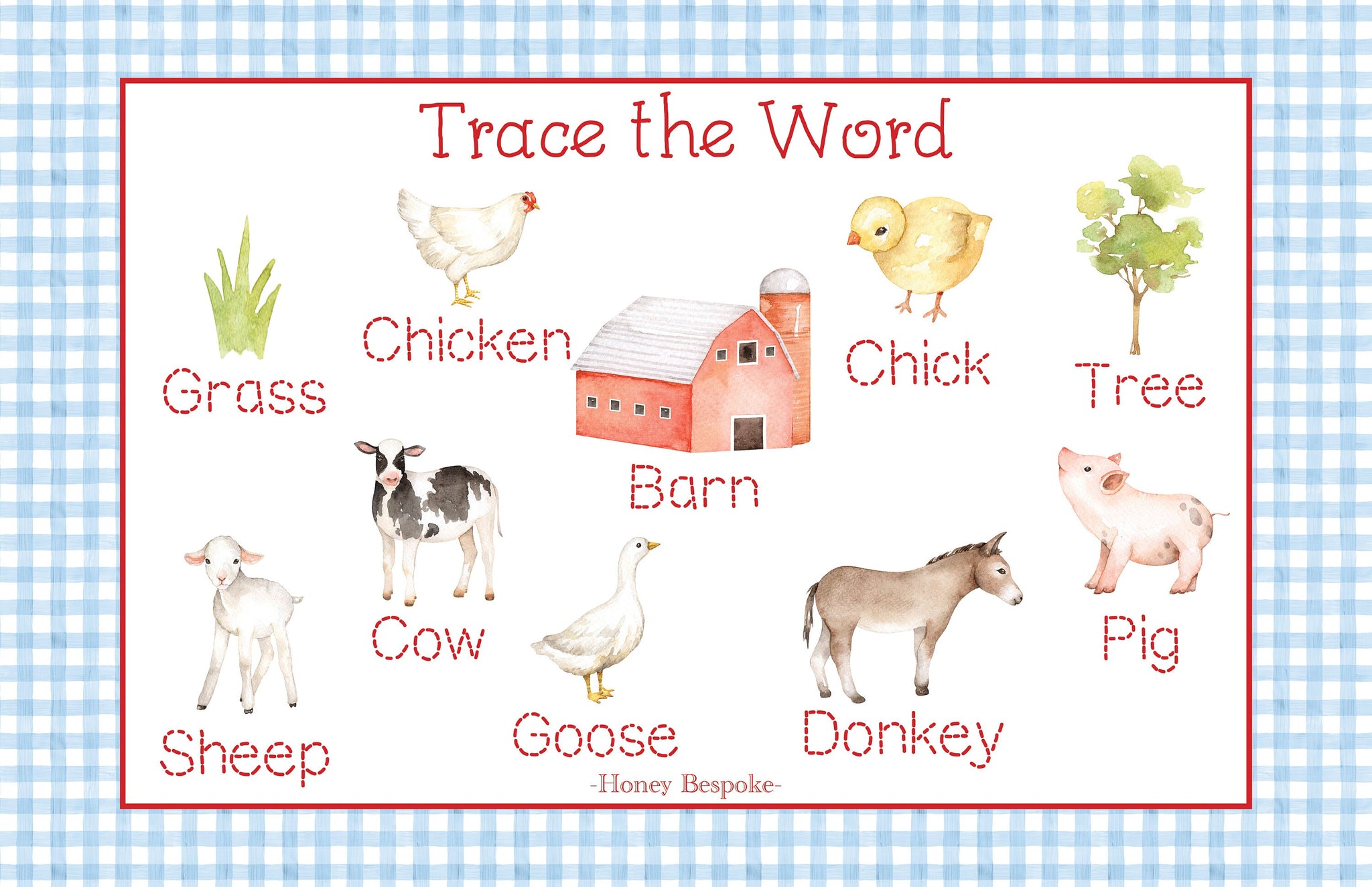 Personalized waterproof laminated farm animals placemat with traceable letters and trace the word learning! Toddler and preschool placemat for fine motor skills and early literacy. Wipe clean and made for daily use at meals! These are the perfect gift for your little one!