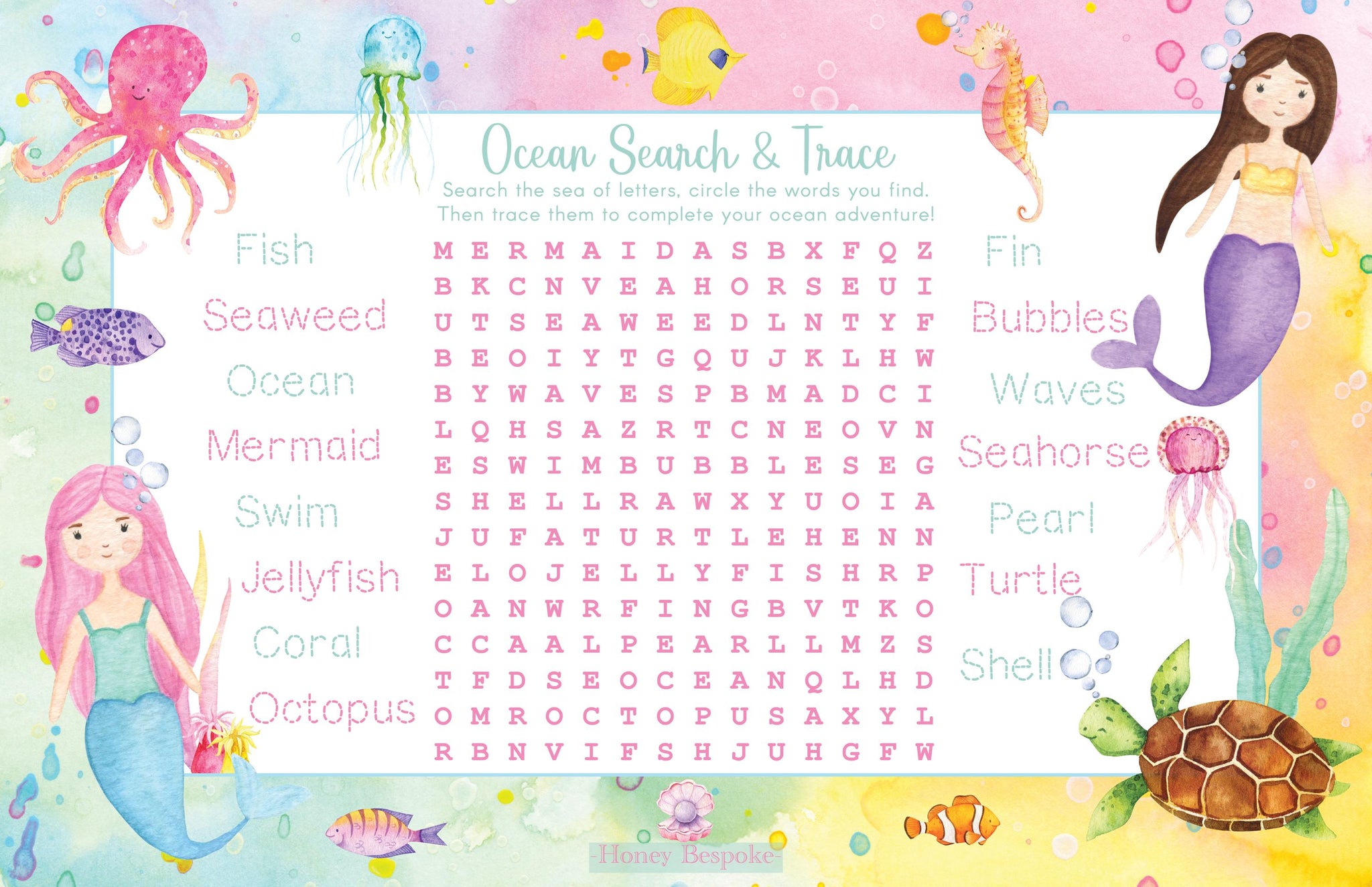 Make mealtime magical with this personalized mermaid and ocean-themed placemat, featuring vibrant watercolor sea creatures and your child’s name. Waterproof and laminated for easy cleanup, it’s double-sided with traceable print and cursive letters on one side and a fun ocean word search with traceable words on the other, perfect for learning through play. A unique and practical gift that turns everyday moments into under-the-sea adventures!