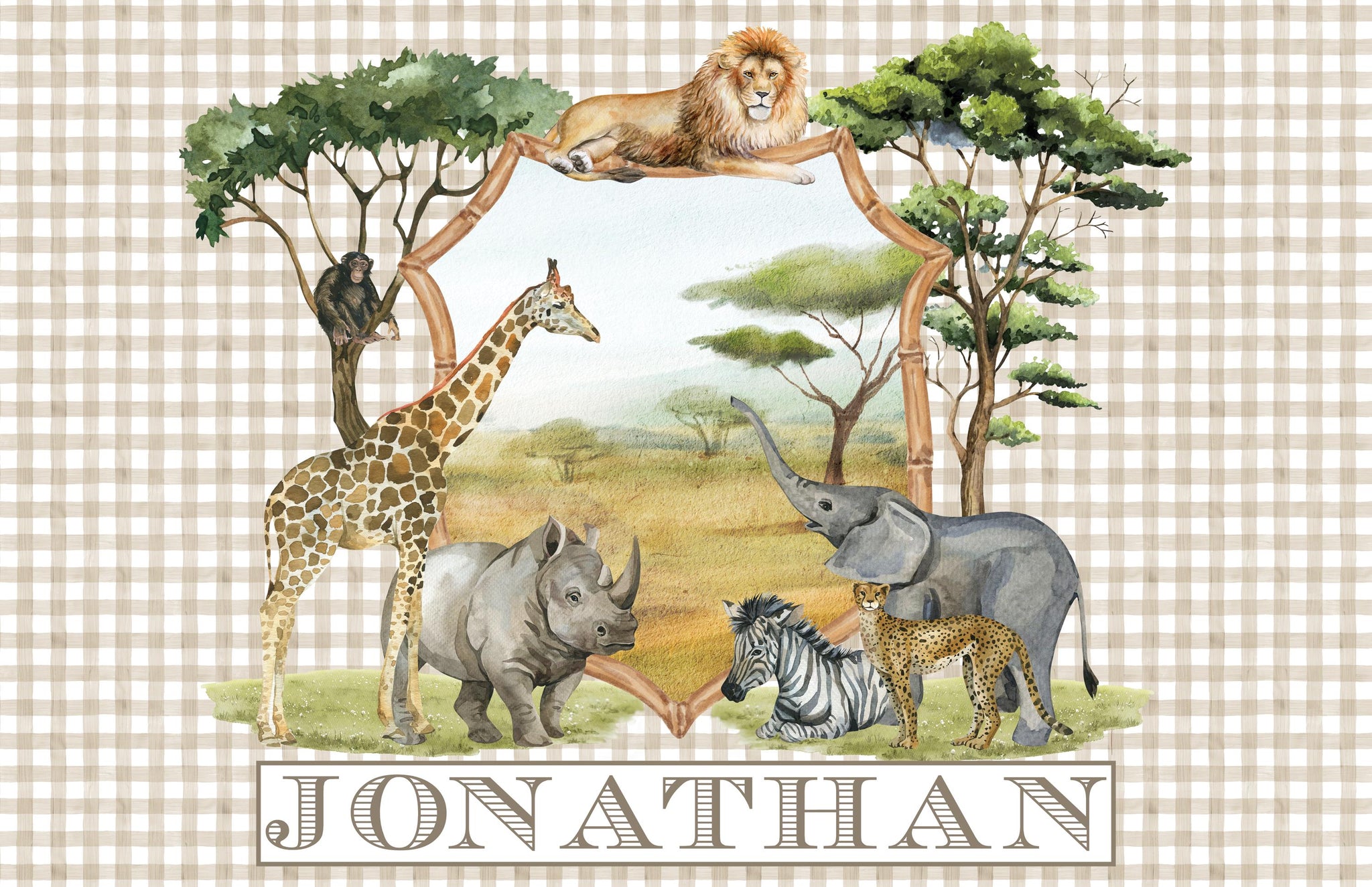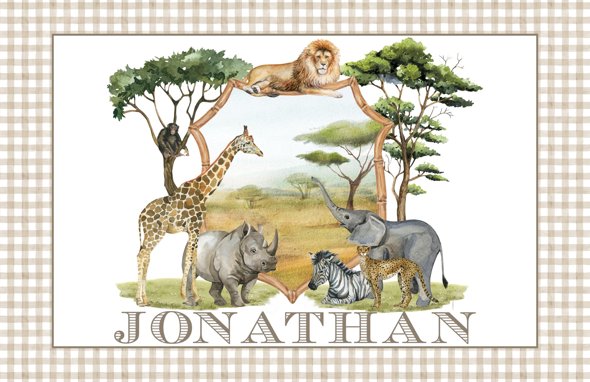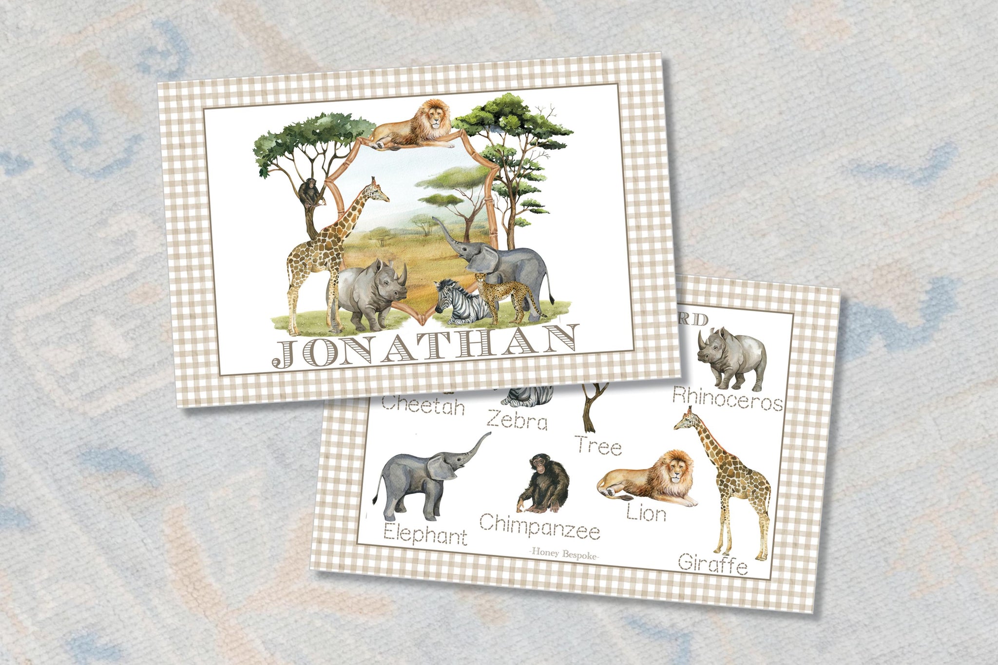 Make mealtime an adventure with this personalized safari animal placemat! Featuring beautifully illustrated African animals on the front and traceable animal names on the back, this laminated kids’ table mat is both fun and educational. A perfect toddler gift for little explorers who love the wild safari!
