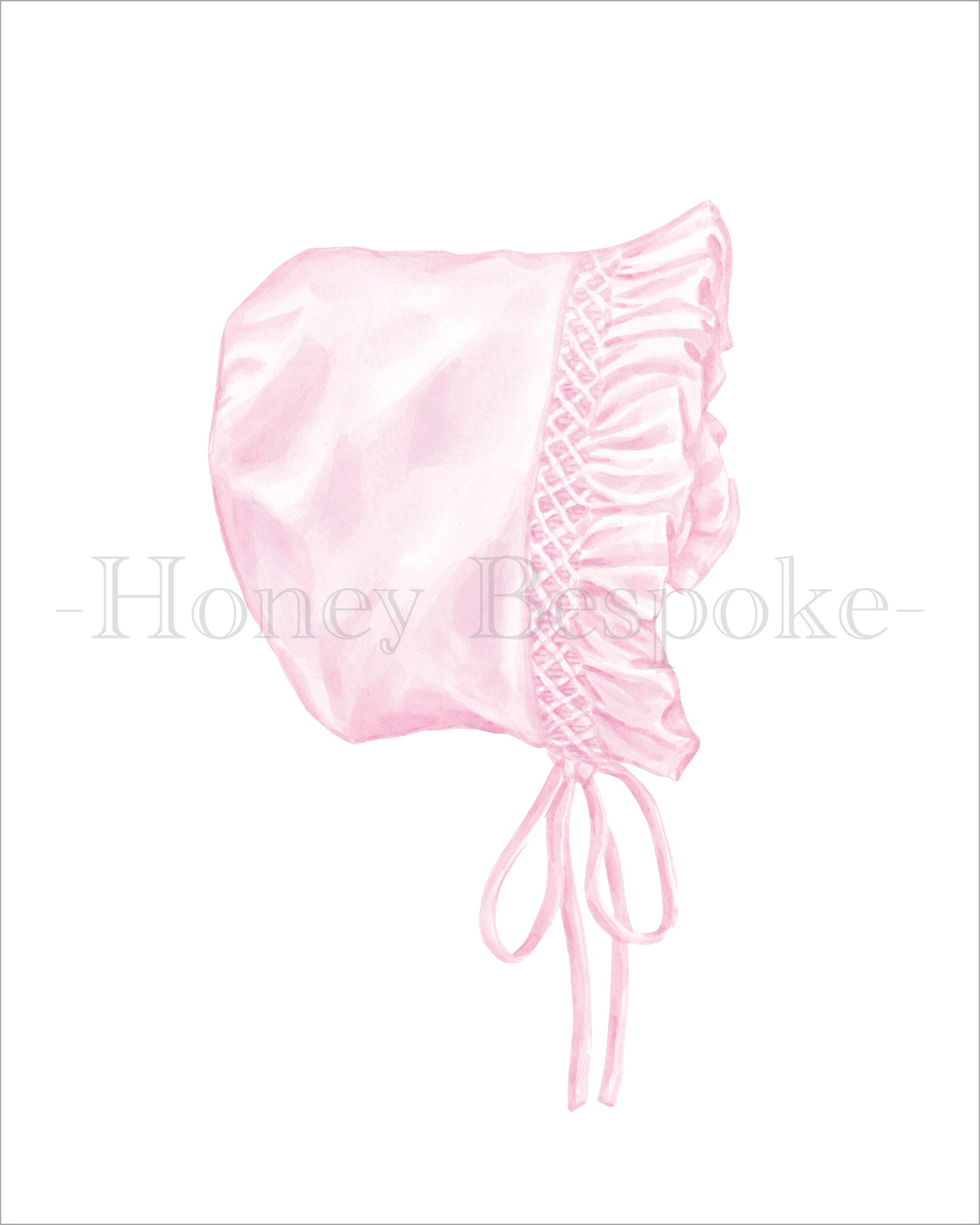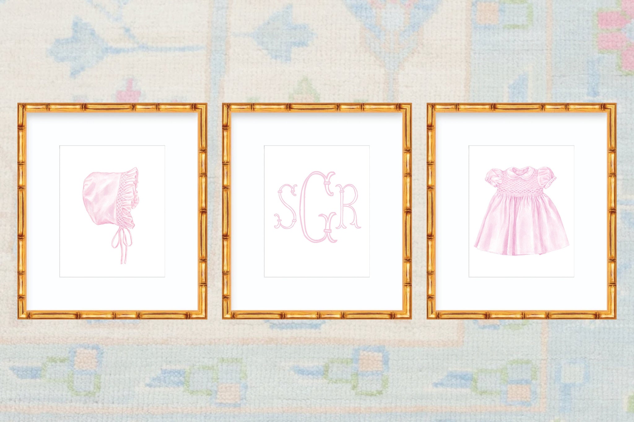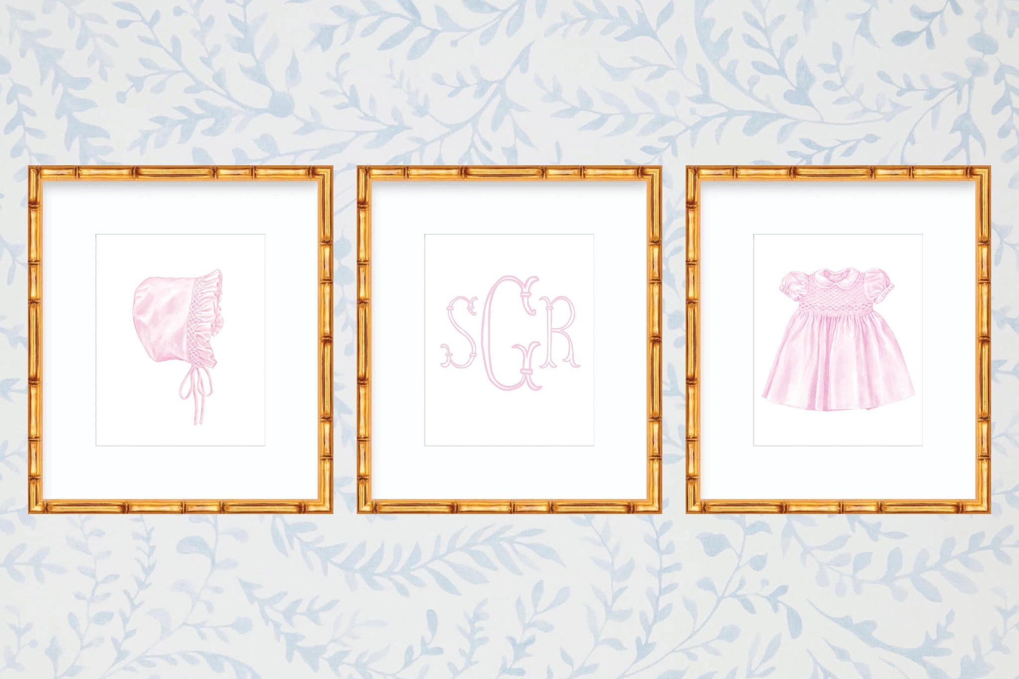 Watercolor Grandmillennial Art Prints With Smocked Dress, Bonnet, and Monogram