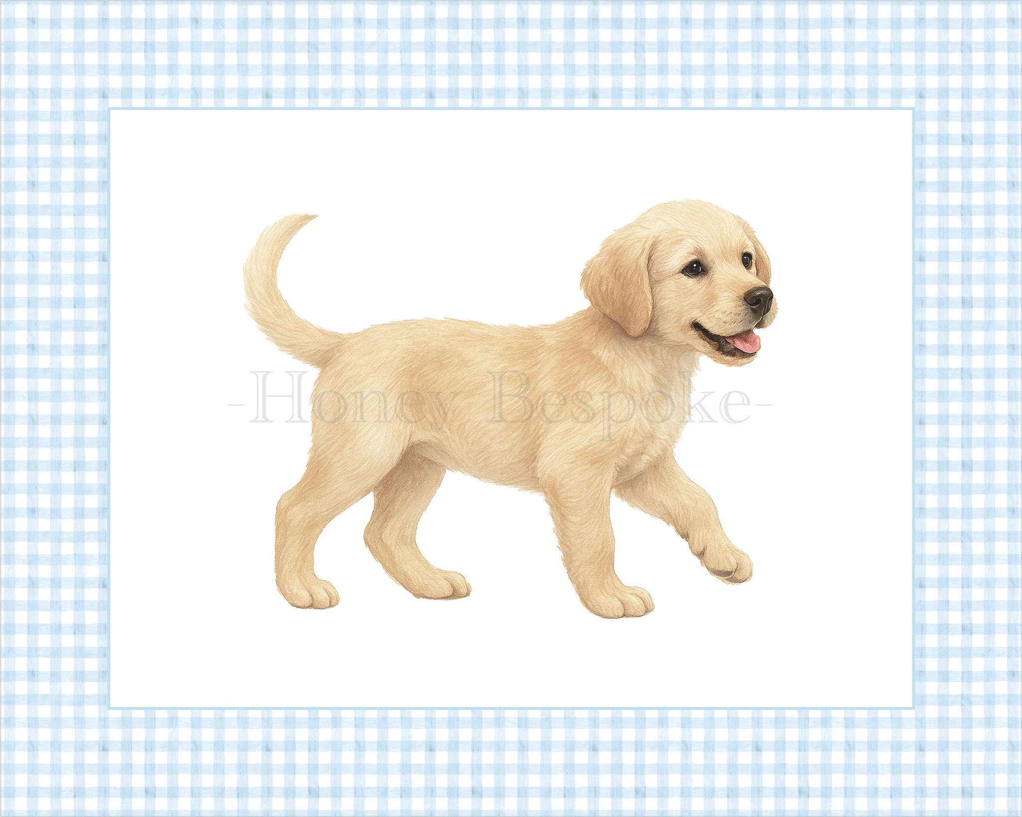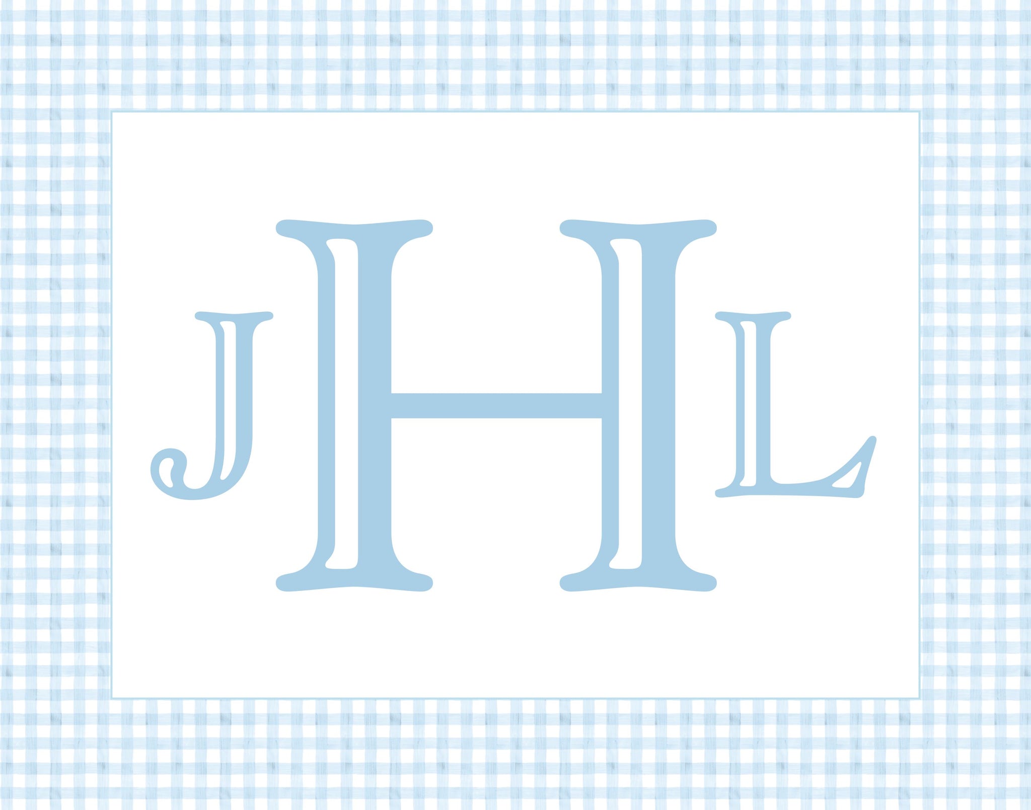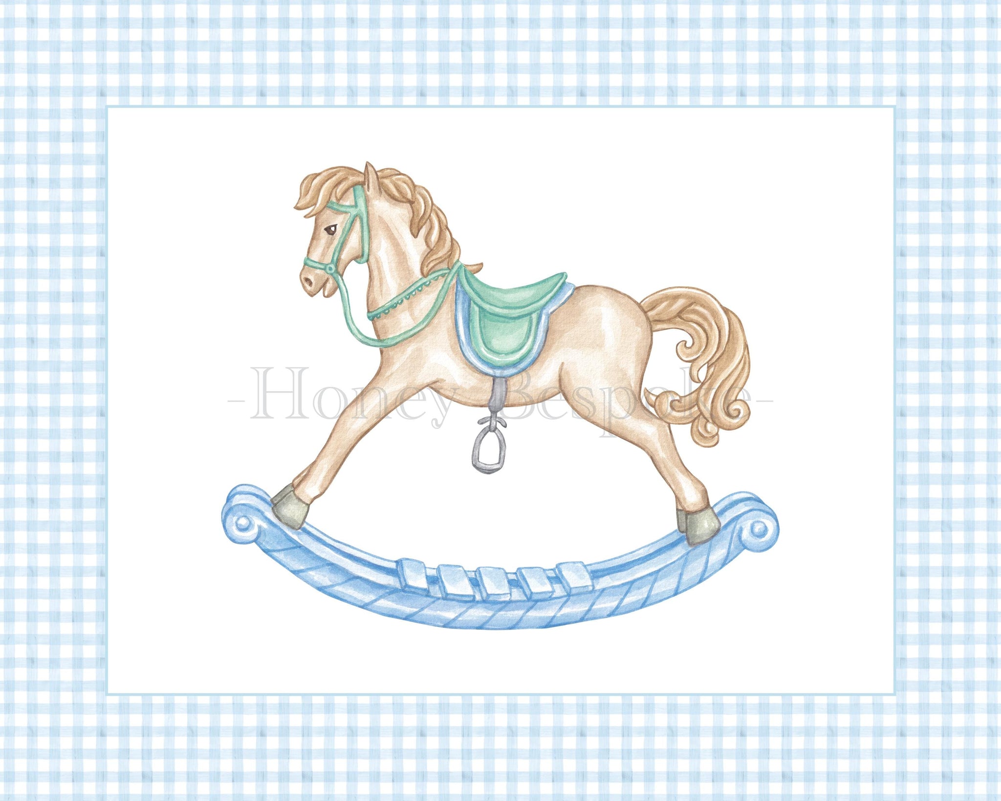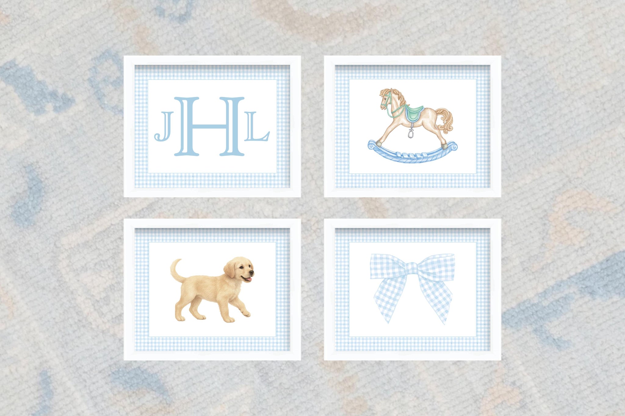 Classic watercolor nursery wall art set for a baby boy featuring preppy blue gingham, a personalized monogram, puppy, gingham bow, and rocking horse nursery art! These boy nursery prints are perfect for a light blue nursery and make a timeless baby shower gift for a dog-themed or classic nursery!